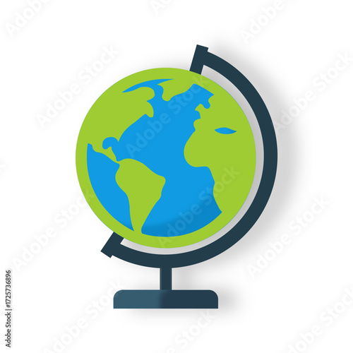 A green globe illustration with black stand, designed in flat minimal style, symbolizing geography, education, travel, world exploration, global learning, and classroom educational tools.