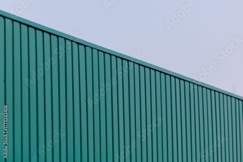 A green metal fence with a white sky in the background