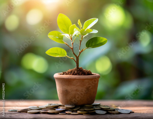 A green plant growing in a pot surrounded by coins, symbolizing prosperity and growth in nature