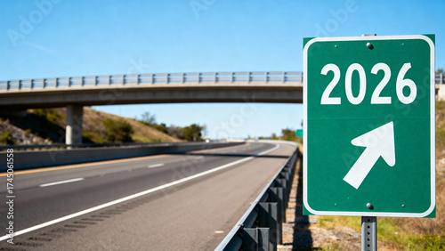 A green sign with the year twenty twenty six and an arrow on a highway with an overpass above it