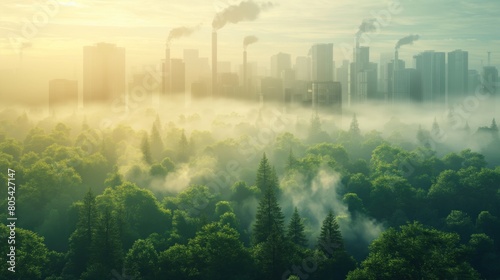 A green sprout makes its way through the ground against the backdrop of smoking factories. Concept of environmental pollution and environmental problems.