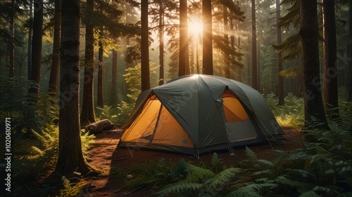 A green tent sits in a forest with the sun shining through the trees.