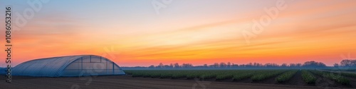 A greenhouse is in the middle of a field with a beautiful sunset in the background. The sky is filled with clouds, and the sun is setting, creating a warm and peaceful atmosphere