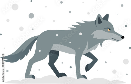 A grey wolf strides confidently through falling snowflakes in a winter landscape.