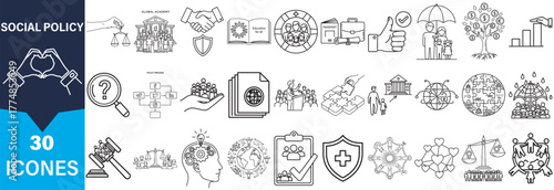 A grid of 30 hand-drawn icons representing social policy concepts, presented in a clear silhouette style.