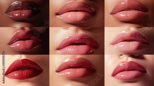 A grid of close-up shots of lips, featuring soft pink tones, natural fullness, and glossy textures with sharp focus and blurred backgrounds.