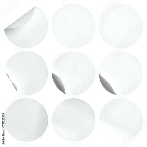 A grid of nine blank, white circular stickers, some with peeled corners on a black background