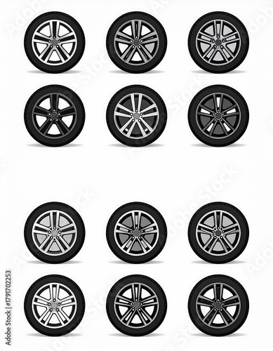 A grid of nine various car tires each with unique rim designs on a white background with shadows