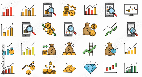 A grid of thirty 2D flat linear art icons depicting various financial and market trends against a white background. The design features an overall digital and vector aesthetic.