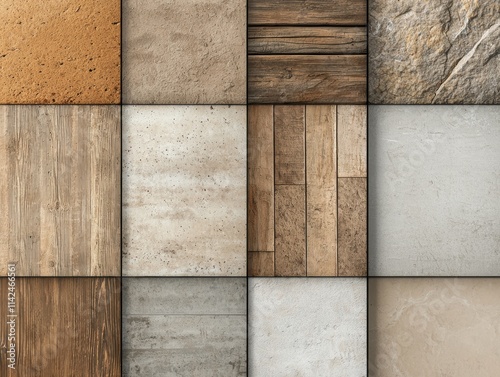 A grid of various textures, featuring wood, stone, and concrete surfaces, showcasing a diverse range of patterns and colors.