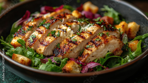 A grilled chicken Caesar salad with Parmesan shavings and homemade croutons