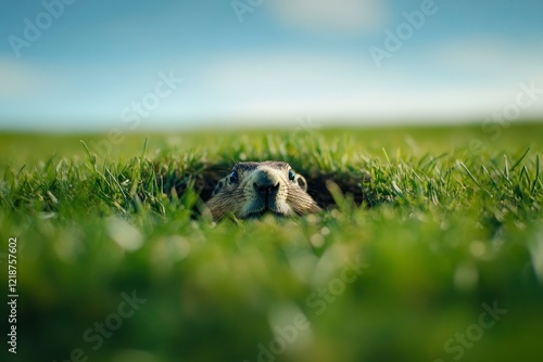 A groundhog peeks out of its burrow on the grassy field, its focused eyes.