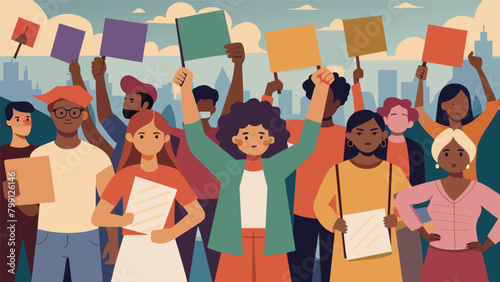A group of activists holding signs with powerful messages of equality and justice stand in front of a large crowd at the community freedom sing using. Vector illustration