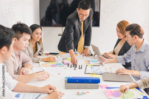 A group of Asian businessmen are discussing their work.All people share brainstorm ideas at work.
