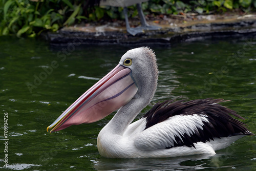 a group of Australian pelicans swimming in a pool