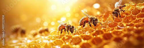 A group of bees are on a honeycomb. There are five bees in total. One of the bees is on the left side of the honeycomb, two are in the middle, and two are on the right side