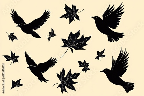 A group of birds and leaves in mid-air, capturing a moment of flight and movement