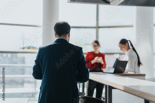 A group of business people discuss ideas in a bright, modern office environment. The atmosphere is collaborative and productive, showcasing teamwork and innovation among colleagues.