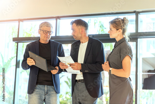 A group of business professionals reviews documents in a modern office, advises lawyers, and provides business consulting