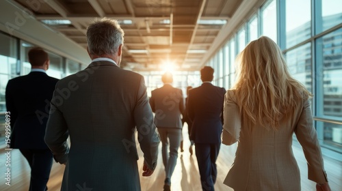A group of business professionals walking together in a sunlit corridor, embodying collaboration and ambition as they head towards a promising future.