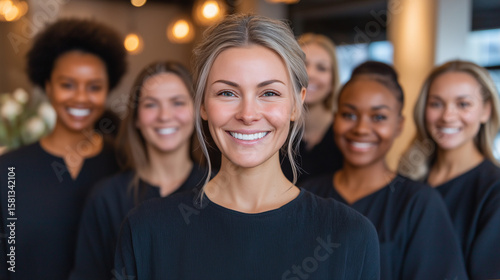 A group of cheerful and confident beauty professionals standing together in a modern salon, wearing matching black uniforms. The warm lighting and sleek interior highlight their un
