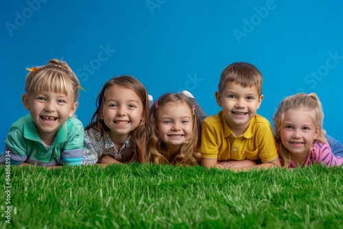 A group of children are laying on the grass and smiling