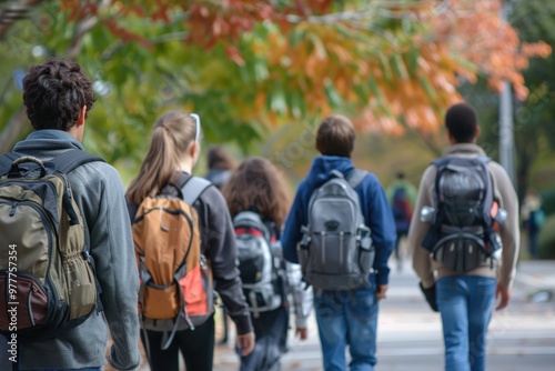 A group of children are walking down a road, each carrying a backpack, generative ai image