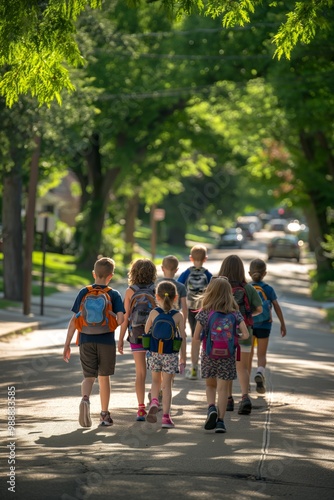 A group of children are walking down a street, some of them carrying backpacks. Scene is lighthearted and playful, as the children are enjoying their walk and each other's company