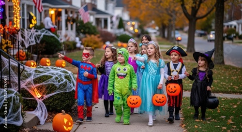 A group of children in Halloween costumes trick-or-treating on a suburban street, carrying pumpkin-shaped candy buckets, with decorated houses in the background.