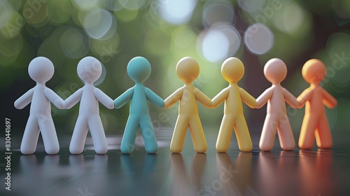 A group of colorful plastic toy people holding hands with a blurred background.