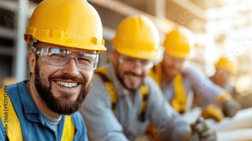 A group of construction workers in yellow safety helmets are working together on a building site, focusing intently on their tasks while displaying a strong sense of teamwork and dedication.