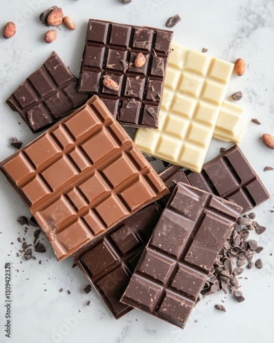 A group of different chocolate bars with varying cocoa percentages, informative style
