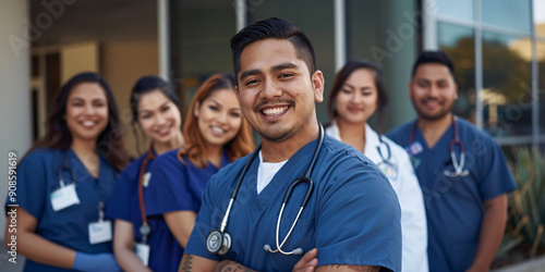 A group of diverse healthcare professionals, including nurses and doctors, stand together smiling confidently in their uniforms.. caucasian man