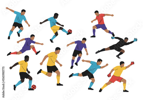 A group of diverse male soccer players in various action poses, kicking, running, and goalkeeping.