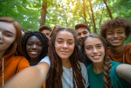 A group of diverse teenagers take a selfie in the woods