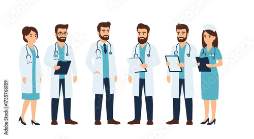 A group of doctors and nurses standing together, some holding clipboards, in a professional medical setting.
