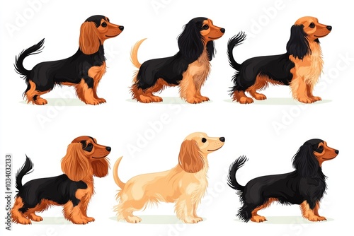A group of dogs standing side by side, possibly waiting for their owner or enjoying the outdoors