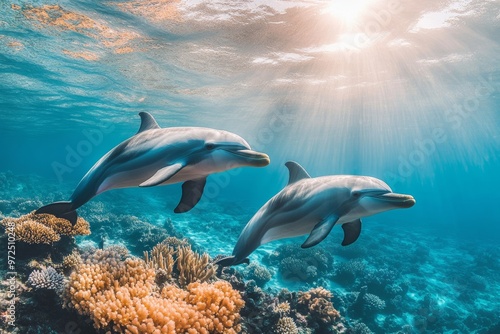 A group of dolphins swimming in colorful underwater scenery, created by stock