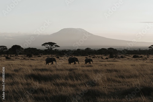 A group of elephants walking through the savanna with Mount Kilimanjaro