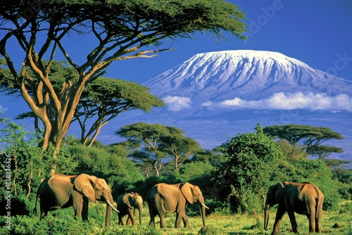A group of elephants walking through the savanna with Mount Kilimanjaro