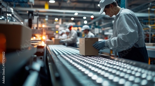 A group of factory workers stands by a conveyor belt, carefully packaging products as the line moves steadily during a demanding work shift
