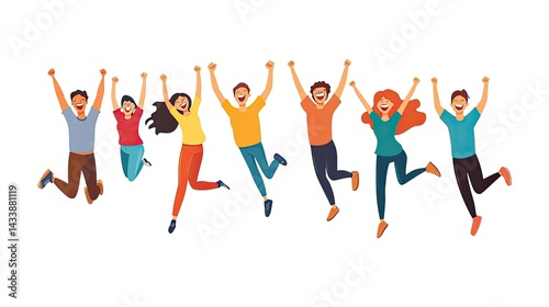 A group of five young adults is joyfully jumping against a clear blue sky.