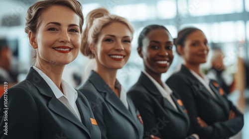 A group of flight attendants in their uniforms, standing in an airport terminal, ready for duty, showcasing the professionalism and teamwork of airline crew members
