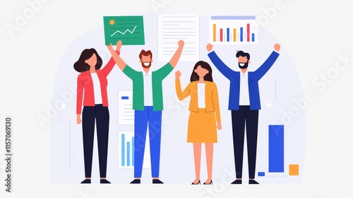 A group of four diverse people celebrating success with graphs and documents, showcasing teamwork and positive results in a professional setting.