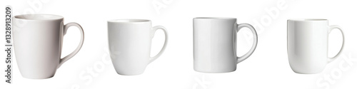 A group of four identical white ceramic mugs or cups arranged on a plain background suitable for serving hot drinks like coffee or tea