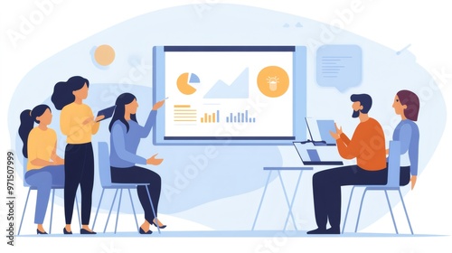 A group of four people are gathered around a whiteboard with graphs and charts, listening to the person presenting their idea.