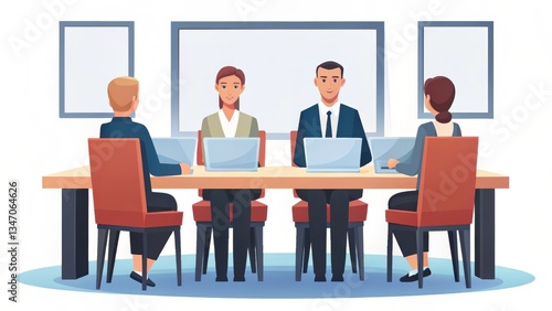 A group of four professionals engaged in a meeting at a conference table, working on laptops and collaborating in a modern office setting.