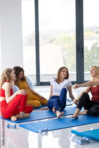 A group of four women sits cross-legged on yoga mats in a well-lit fitness studio, engaging in a friendly conversation.