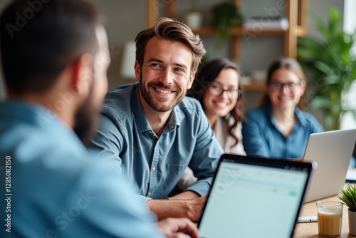 A group of four young adults engaged in a collaborative meeting in a modern workspace, sharing ideas and digital devices, fostering teamwork and creativity.