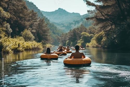 A group of friends enjoying a day of tubing on a sparkling lake, their laughter echoing across the water